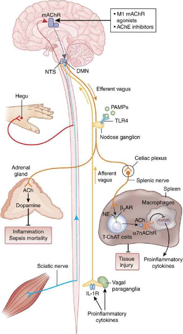 이때 뇌의 명령을 받아 작동하는 대표적인 신경이 바로 미주신경이며, 그 출력은 부교감신경계, 특히 아세틸콜린을 통한 대식세포 억제 기전과 관련이 있습니다.