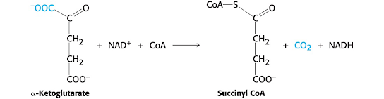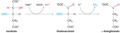 그런데 이렇게 해서 만들어진 alpha-KG는 이미 COOH를 가지고 있는데 이것은 이때 COOH의 산소 하나는 앞 단계에서 물이 반응하면서 만들어진 것입니다.