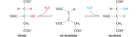 시트르산은 isocitrate로 전환되는데 이 과정에서 물이 들어가고 다시 물이 빠져 나오는데, 이 물은 CO2와는 직접 상관은 없습니다. 하지만 빠져나간 물의 OH는 탄수화물에서 가지고 있던 것이지만 들어간 물의 OH는 원래는 수소만 있던 곳입니다. 바로 여기서 물이 한 번 더 들어가고, 이 물의 OH가 CO2로 빠져 나가기 때문에 이 부분에서 물이 CO2로 전환되는 것입니다. 이것을 순차적으로 보면, 다음과 같습니다.
