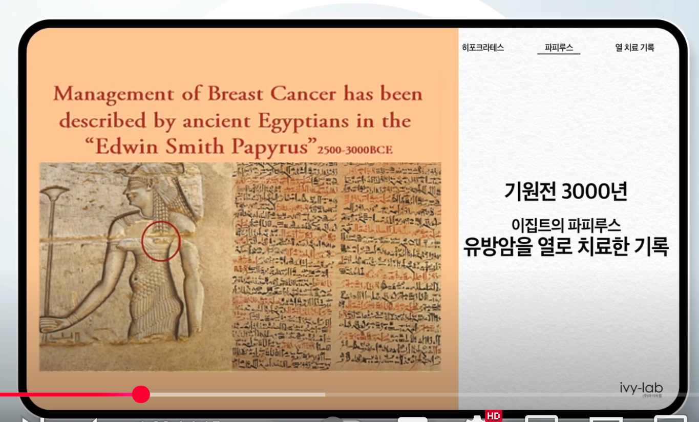 그 이후 암에 대한 기록은 거의 없었습니다. 그러다가, 그리스 시대의 히포크라테스 시기에 오면 암에 대한 기록이 나오기 시작하고 사실 암이라는 단어를 영어로는 cancer 라고 하고, cancer는 별 자리 중에서는 게자리를 의미합니다. 이러한 명명은 히포크라테스 시대에 생긴 것입니다. 그리고 최초의 유방암 환자를 기록한 것도 그리스였습니다. 다만 그 유방암 환자는 그리스 사람이 아닌 지금의 이란, 당시 페르시아의 유명한 왕비인 아토사 였습니다.